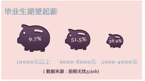 暑假已接近尾聲,新一波的高校招聘大幕即將拉開。就業、考研、留學、創業以及“待業”,如今的年輕人擁有更多的選擇,這讓他們對上班工作 “意興闌珊”,也抱有更大的期望。中國最大人力資源服務商前程無憂今天發布《2014高校畢業生就業狀況》報告。報告說, 盡管2014畢業生比2013年多出28萬人,超過一半的2014名校畢業生希望起薪達到每月6000~8000元,比上年高出了近9個百分點。與此同時,雇主的招聘成本不斷提升,2014年招聘人均成本達到3204.元,有超過4成的畢業生存在“毀約”的情況,讓HR們叫苦不迭。