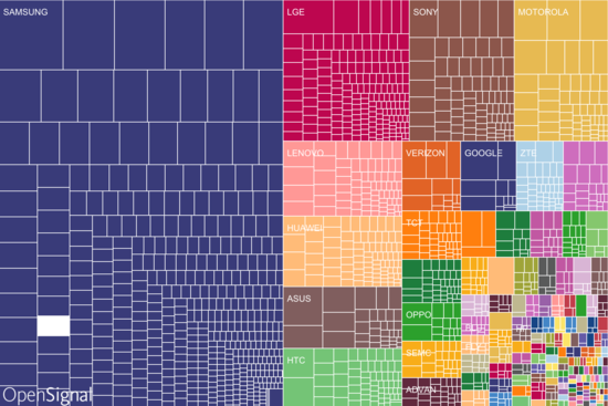 圖中最大的變化不是三星的主要競爭對手?jǐn)U展了多少份額,而是上百家小型廠商的出現(xiàn)。OpenSignal表示發(fā)現(xiàn)了1294家獨立生產(chǎn)商,其中超過1000家在2012年的時候還根本不存在。值得注意的是,一些2012年還存在的廠商現(xiàn)在已經(jīng)消失了,所以我們看到的增幅或許沒有那么大。