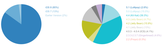 盡管越來越多的制造商對軟件開發(fā)者來說可能不是好事,但對碎片化的抱怨日益消失是有原因的。安卓用戶逐漸集中在幾個最近發(fā)布的系統(tǒng)版本上,57%的設(shè)備在運行KitKat或更新的版本。91%的設(shè)備運行Jelly Bean或更新的系統(tǒng)。但和iOS的狀況比起來,安卓的成績就不算很好了。最新的iOS 8系統(tǒng)運行在超過85%的設(shè)備上。